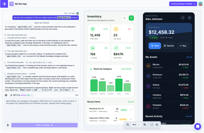 A complete workspace for building cross-platform apps. Design screens visually, preview on any device, edit source code directly, and publish — all without switching tools.